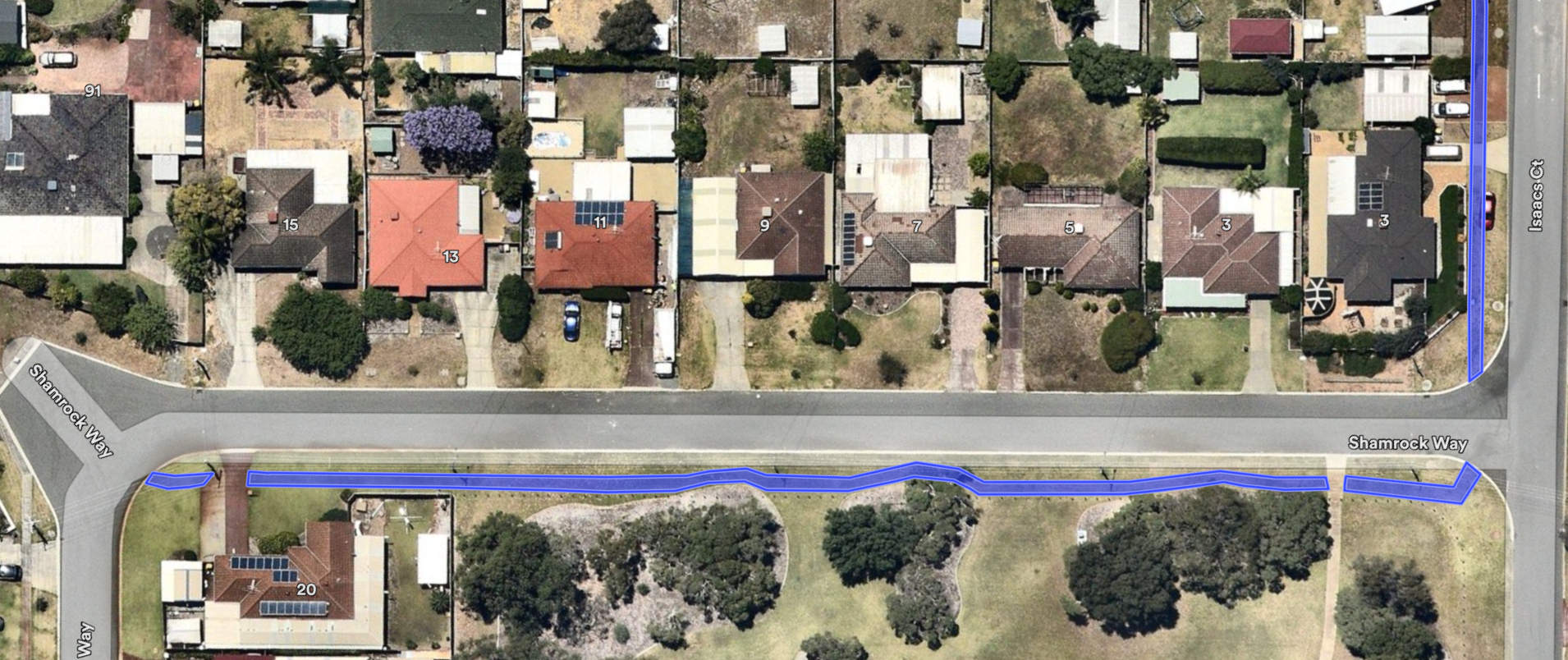 From Isaacs Court, along Isaacs Court Reserve, with kerb ramps at each end.